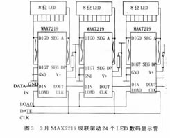 AT89C52的P3.0接MAX7219的串行数据输入端DIN,在CLK的上升沿,串行数据从DIN装入到内部16位移位寄存器中。在CLK下降沿的DOUT端数据有效。本系统采用3片MAX7219进行级联,来驱动24个LED数码管,分别显示电池的4个参数值及各分档测量值的统计结果。图3为3片MAX7219级联驱动24个LED数码管。
